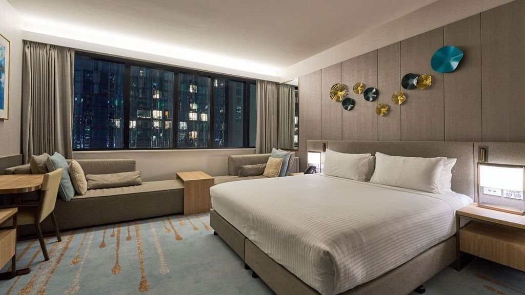 Nestled at the heart of the room is the majestic king-sized bed, inviting and plush, ensuring restful nights after vibrant city days. Our distinctive day bed beckons you to unwind, offering a cozy nook to read, relax, or simply daydream.